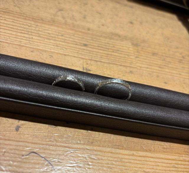工房の方が使い続けるにつれて、段々と自分の指に 馴染んでいく。とおっしゃっていたんですが 約1年ほど付けっぱなしで基本的に生活をしていて 抜けにくくもなり肌な色にも馴染んで来ました。 工房で製作した際に磨き方やケアの仕方も 丁寧に教わっていたので、定期的に旦那と 磨くようにしています。 工房からヤスリとクロスも頂いているので 定期的にケアをしているんですが、自分たちで 更にケアをすることによってもっと愛着も湧いてきます!
